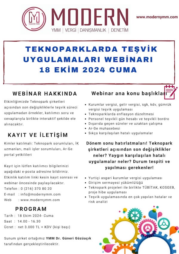 Sizleri bu alandaki uzmanlığımızla 18.10.2024 Cuma günü saat 14:00-16:30 arasında interaktif olarak gerçekleştireceğimiz Teknoparklarda teşvik uygulamaları webinarımıza (online) davet etmekten memnuniyet duyarız.