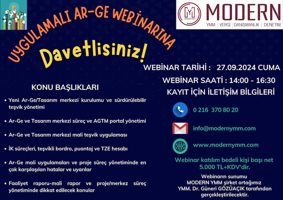 Sizleri bu alandaki uzmanlığımızla 27.09.2024 Cuma günü saat 14:00-16:30 arasında interaktif olarak gerçekleştireceğimiz Ar-Ge webinarımıza (online) davet etmekten memnuniyet duyarız.