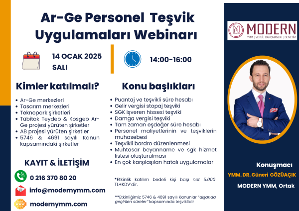 Sizleri bu alandaki uzmanlığımızla 14 Ocak 2025 Salı günü saat 14:00-16:00 arasında interaktif olarak gerçekleştireceğimiz Ar-Ge Personel Teşvik Uygulamaları Webinarımıza (online) davet etmekten memnuniyet duyarız.