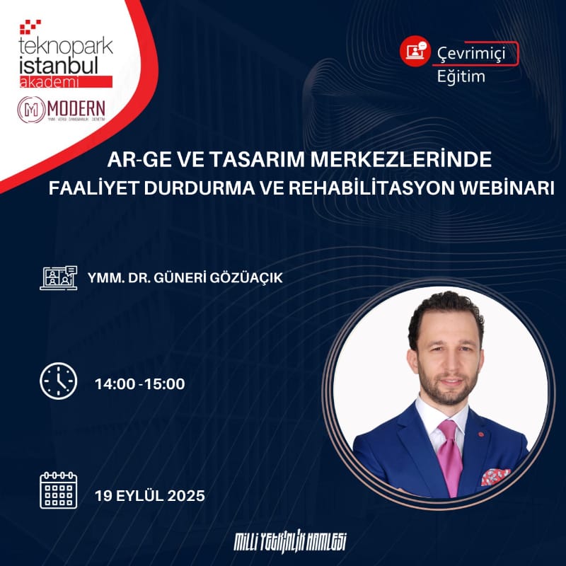 MODERN YMM ve Teknopark İstanbul Akademi organizasyonunda, 19 Eylül 2025 tarihinde Ar-Ge ve Tasarım merkezlerinde faaliyetlerin durdurulması veya AGTM belgesinin iptaline neden olan durumlar ve bu merkezlerin rehabilitasyon programlarının hazırlanmasına yönelik bir webinar düzenliyoruz.