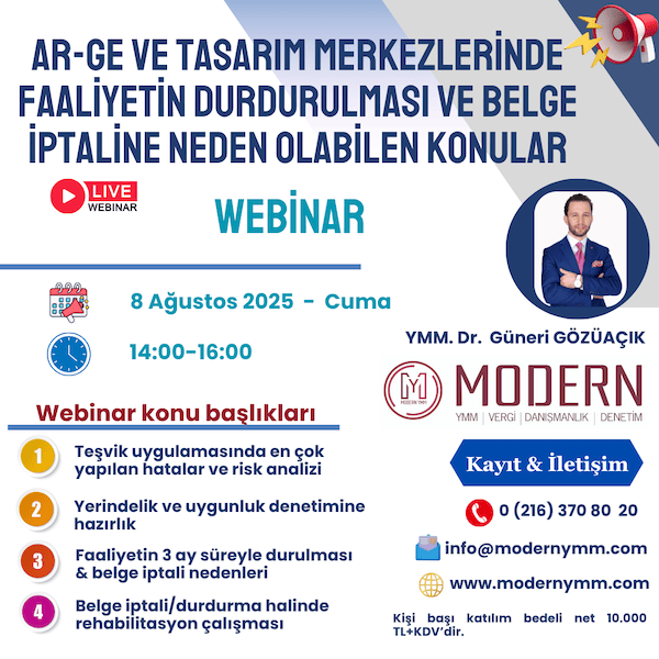 Sizleri bu alandaki uzmanlığımızla 8 Ağustos 2025 Cuma günü saat 14:00-16:00 saatleri arasında interaktif(çevrimiçi) olarak gerçekleştireceğimiz “Ar-Ge ve Tasarım merkezlerinde faaliyetin durdurulması ve belge iptaline neden olabilen konular” başlıklı webinarımıza (online) davet etmekten memnuniyet duyarız.