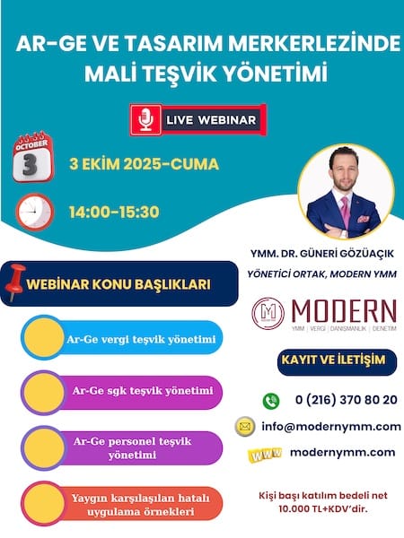 MODERN YMM olarak bu alandaki tecrübemizle, 3 Ekim 2025 Cuma günü AR-GE VE TASARIM MERKEZLERİNDE MALİ TEŞVİK YÖNETİMİ konulu bir webinar düzenliyoruz.