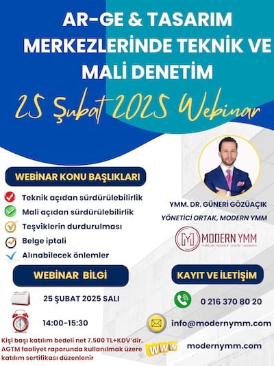 Sizleri bu alandaki uzmanlığımızla 25 Şubat 2025 Salı günü saat 14:00-15:30 saatleri arasında interaktif olarak gerçekleştireceğimiz “Ar-Ge ve Tasarım merkezlerinde teknik ve mali denetim” konulu webinarımıza (online) davet etmekten memnuniyet duyarız.
