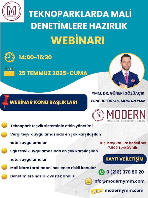 Sizleri bu alandaki uzmanlığımızla 25 Temmuz 2025 Cuma günü saat 14:00-15:30 saatleri arasında interaktif (çevrimiçi) olarak gerçekleştireceğimiz “Teknoparklarda mali denetimlere hazırlık” konulu webinarımıza (online) davet etmekten memnuniyet duyarız.