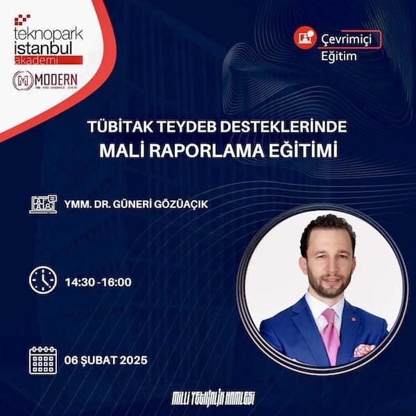 MODERN YMM ve Teknopark İstanbul Akademi işbirliğiyle düzenlenen “Tübitak Teydeb mali raporlama” konulu eğitimimiz çevrimiçi olarak 06 Şubat 2025 perşembe günü 14:30-16:00 arasında gerçekleşecektir.